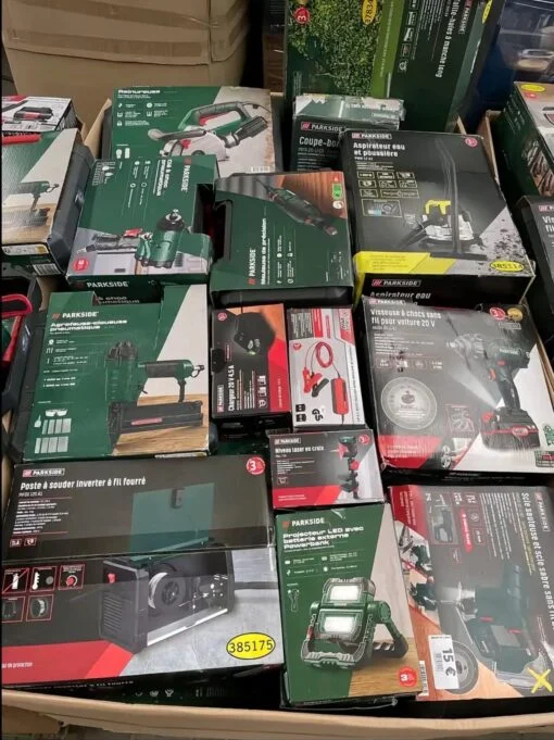 What is the difference between returns pallets and overstock pallets? Returns pallets contain consumer-handled items that may be used or damaged. Overstock pallets contain new, unsold inventory. This parkside tools usa pallet is wholesale surplus, meaning all tools are new and factory-sealed throughout.